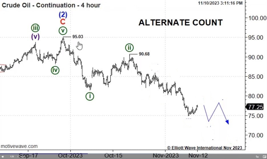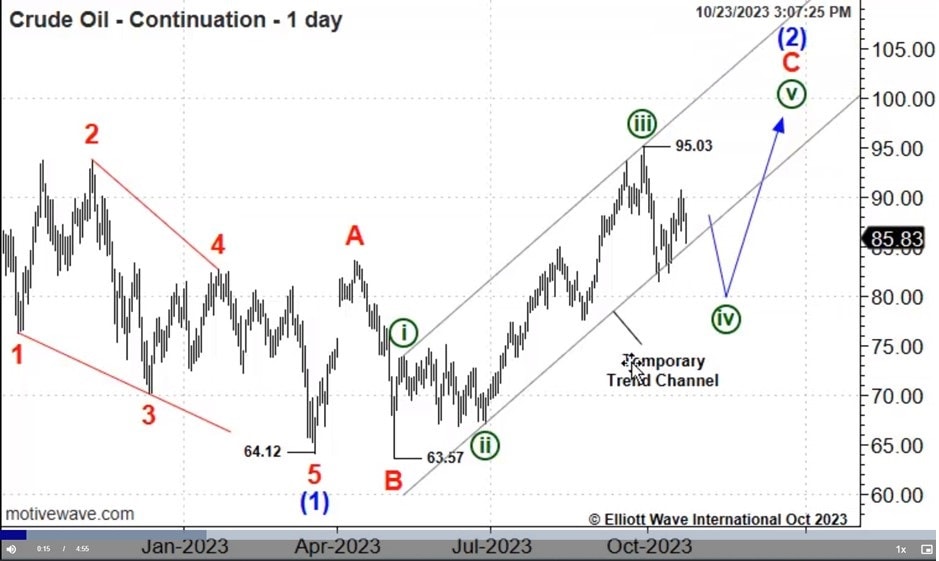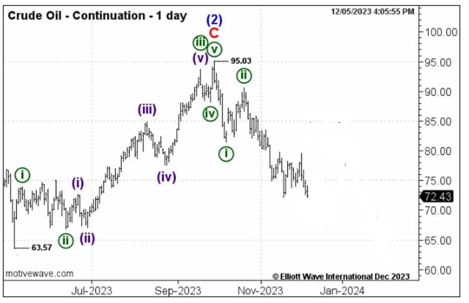 In late October, the Israel-Hamas war stoked bullish oil forecasts. But a bearish Elliott wave pattern warned a downturn was due. The story continues.