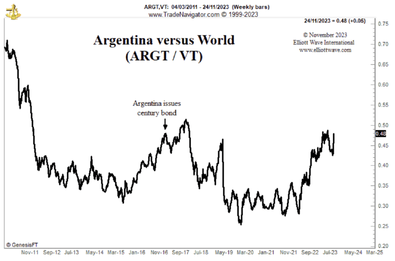 The election of Javier Milei as Argentina’s president makes socionomic sense. After decades of negative social mood, the country has elected someone who has vowed to literally demolish the central bank, U.S. dollarize the economy and close vast swathes of government. The ultra-libertarian economist faces massive challenges in putting those policies into action, but the eyes of the world are now on this experiment.
