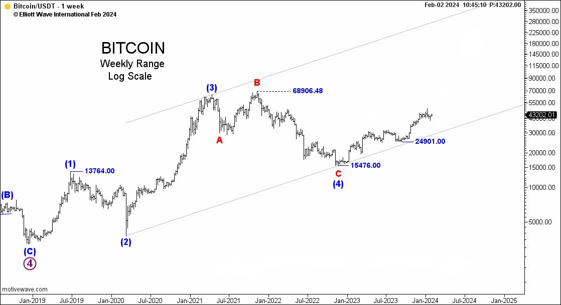Notice that price level of 15,476 marked by the completion of Elliott wave C (which is red). That price level was hit shortly after Tony’s bullish forecast back in early December. You’ll see that, indeed, the price of bitcoin nearly tripled since. Also keep in mind that entire wave labeling is available to subscribers.