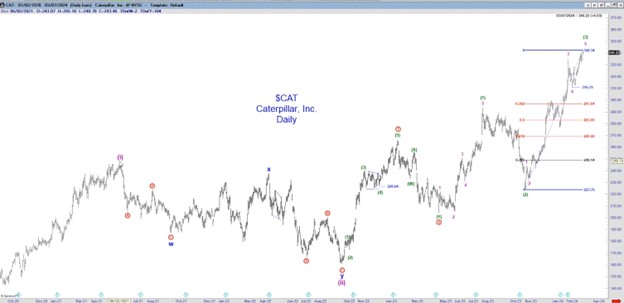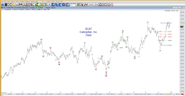 Here’s Caterpillar. This count is aggressively bullish with the series of 1-2, 1-2, 1-2. Each pullback has overlapped the previous high. It should work higher. I would say as long as CAT holds 38% of this third wave at 273.63, it’s in good shape to go higher.”