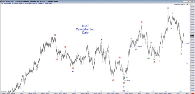 Fortunately, there was a more stable alternative: On November 16, our Trader’s Classroom presented a labeled price chart of CAT. The Elliott wave structure was clear: A second wave retracement was complete, opening the door for a third wave rebound. From the November 16 Trader’s Classroom: