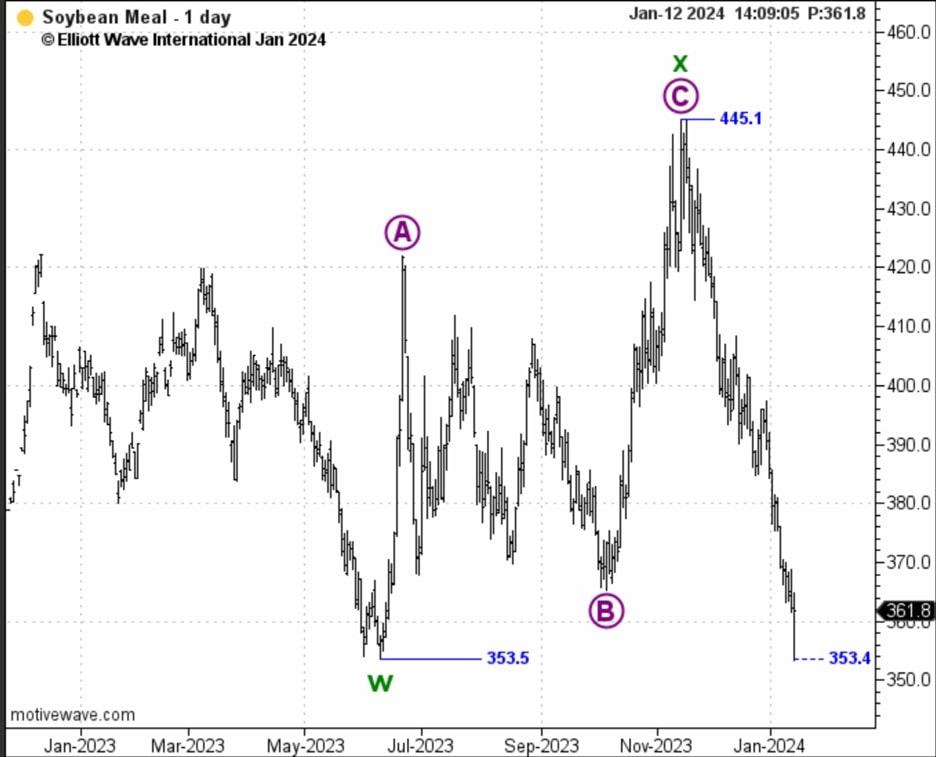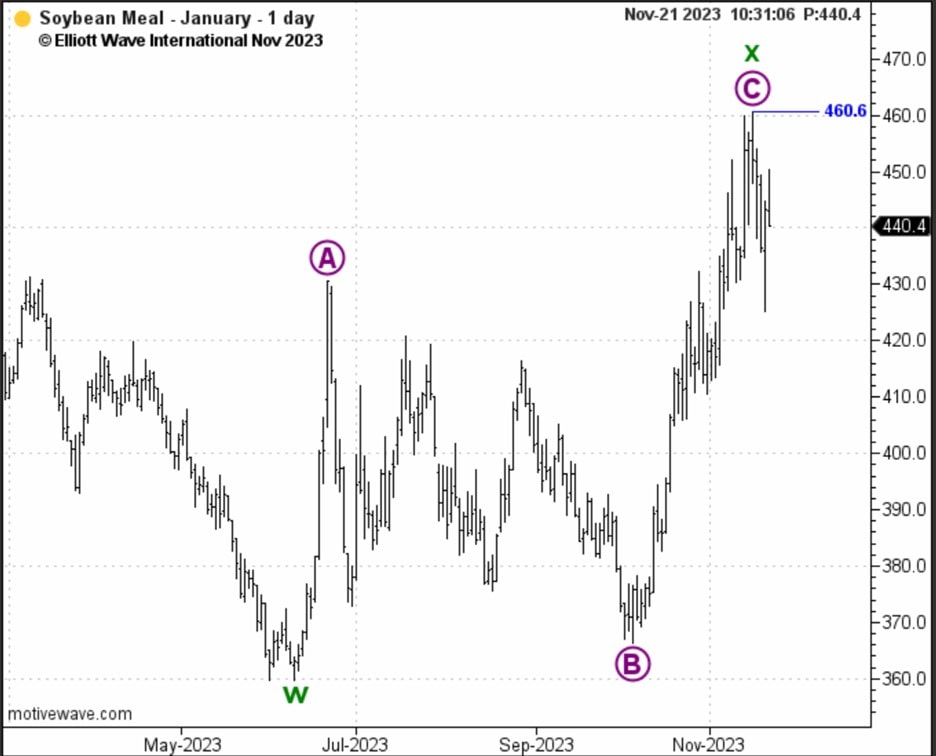 Take, for example, the recent performance in soybean meal. On November 21, our Commodity Pro Service identified a specific Elliott pattern on soymeal’s chart: an Elliott wave zigzag. This is a three-wave correction labeled A-B-C in which wave B terminates before the start of wave A.