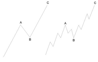 The other distinguishing characteristic of zigzags is that wave C travels significantly beyond the end of wave A, like this: