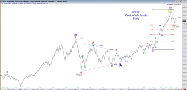 It may be done correcting. We’ve got this pullback. It’s potentially large enough to be done, meeting 38% of the third wave. If Costco can take out this last high at 741, then maybe it’s back on its way up.