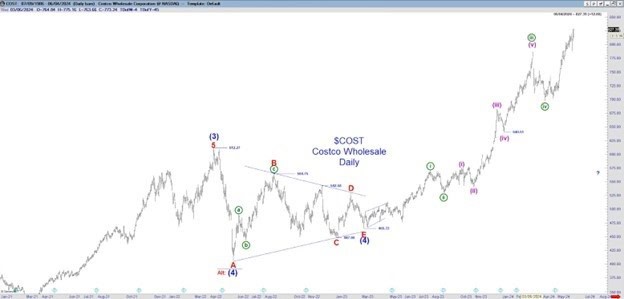 But, from an Elliott wave perspective, the big picture in COST is revealing itself one objective piece at a time. On April 17, our Trader’s Classroom presented the following labeled price chart of COST. It showed prices nearing the end of a fourth wave correction, setting the stage for a fifth wave rebound.