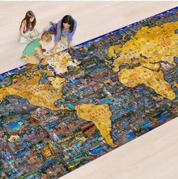 This Costco jigsaw puzzle contains 60,000 pieces broken up into 60 sections of 1,000 pieces each that all connect to create one giant puzzle. When finished, the What a Wonderful World puzzle measures 8 feet tall and 29 feet long.