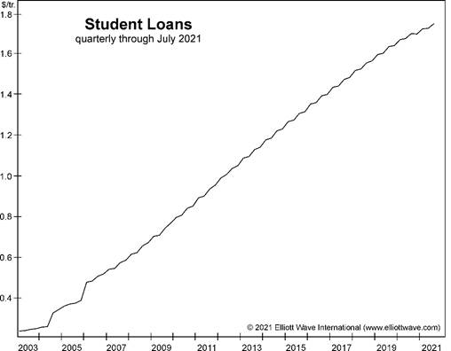 Total student debt has reached $1.75 trillion [in 2021]. Although this is private debt held by individuals, it is promoted and backed by the government. These are the same conditions that jacked up real estate debts and prices before the last bust.