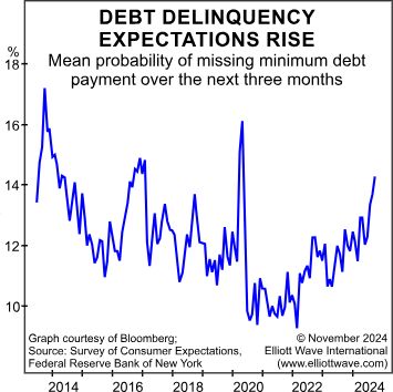 It’s a double whammy: U.S. credit card defaults jump to the highest level since 2010 as personal savings dry up. Expectations for the months ahead are even more glum – as our November Elliott Wave Financial Forecast lays out: