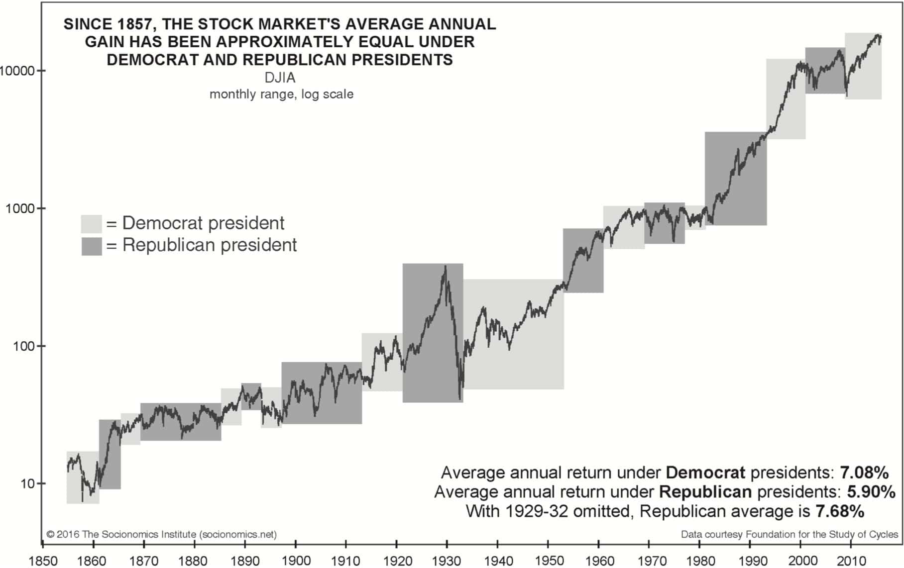 In the book Socionomic Causality in Politics, Matt Lampert referenced a multi-hyphenate Princeton University research paper that showed no outstanding correlation between the party in the White House and economic performance. Lampert wrote: