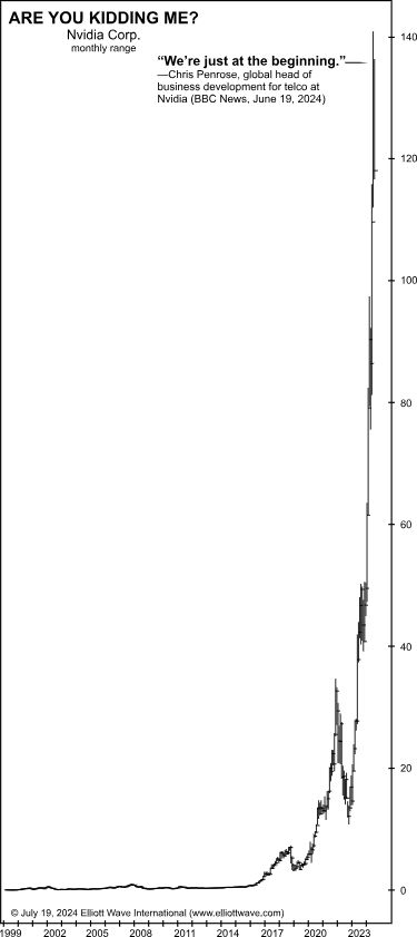 The reason people pile into financial manias near tops is that they think the trend will never end. Last month, an Nvidia spokesman announced that the mania for stocks of companies that make chips to run AI is “just at the beginning.” Look at the chart. Wouldn’t that statement have been brilliant had it been made in 2015? But no, we heard it after Nvidia had risen nearly 600,000% to a value of $3.4 trillion, which is more than the value of Apple, more than Microsoft, more than the entire stock market of France, more than the entire stock market of the U.K., and more than 12% of the U.S. GDP for 2023, and after the head of the company became such a celebrity that he is called “the Taylor Swift of tech.” But hey, it’s just getting started.