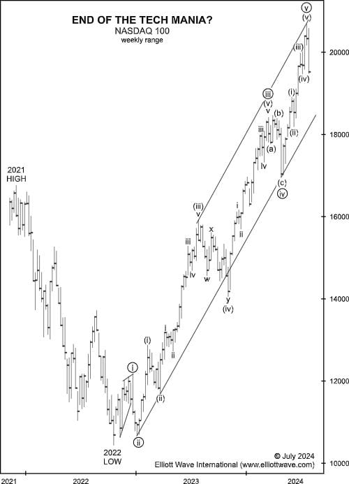 The NASDAQ 100, the most representative index of mania-centric, computer-technology stocks, traced out a five-wave impulse from its low on October 13, 2022 to its high on July 10, 2024. As shown here in the chart, the rise adhered to an Elliott-wave trend channel.