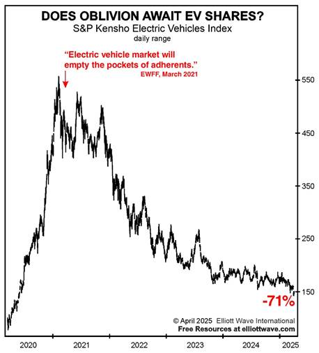 One month later, the Elliott Wave Financial Forecast issued this warning: “The electric vehicle market is another green ‘money machine’ that will ultimately empty the pockets of adherents.”