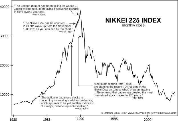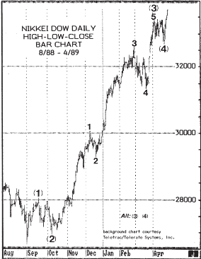 The May 1989 issue showed subscribers that the Nikkei was in the final leg of a five-wave trend, via this chart and forecast: