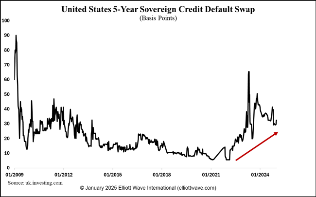 Default risk is already on the rise for the U.S. government as can be seen from the chart below of the 5-Year Sovereign Credit Default Swap (CDS). This is the cost of insuring against a default, and it has risen six-fold since 2022, advancing from just 5-basis points to over 30. Expect this to continue to rise as worries increase over the U.S. fiscal situation: