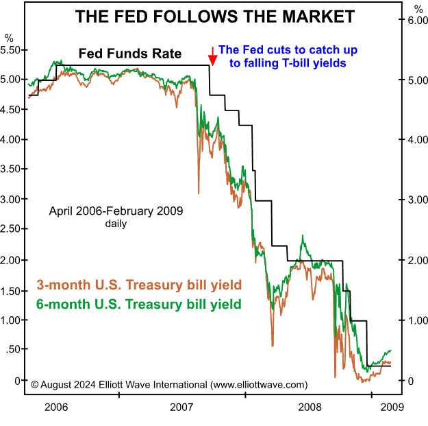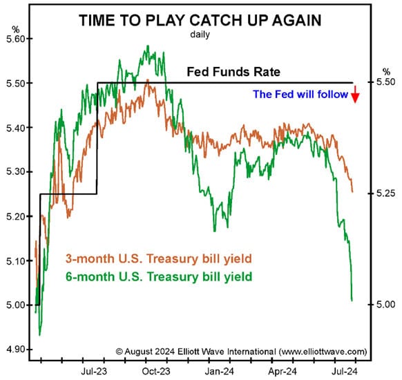 The Fed’s decision to cut the fed funds rate by an “extra-large half-percentage point” (Axios) on September 18 is another example of the Fed simply following the market. In the August Elliott Wave Financial Forecast, we noted that the yield on both 3-month and 6-month Treasury bills had dropped well below the fed funds rate. We showed the chart below and said, “The pressure is mounting on the Fed to lower the fed funds rate to align with T-bill rates, which again are signaling impending economic weakness. The more the Fed waits, the more dramatic their reduction will be as they play catch-up to the market.”