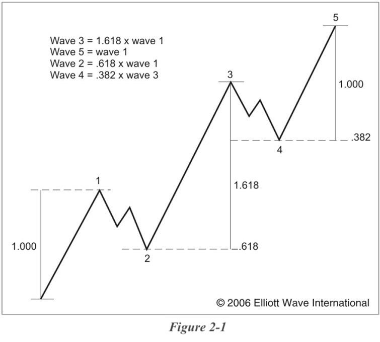 The Wave Principle also provides price targets based on common pattern relationships. When R.N. Elliott wrote about the Wave Principle in Nature’s Law, he stated that the Fibonacci sequence was the mathematical basis for the Wave Principle. Elliott waves, both impulsive and corrective, frequently adhere to Fibonacci proportions, as illustrated in Figure 2-1.