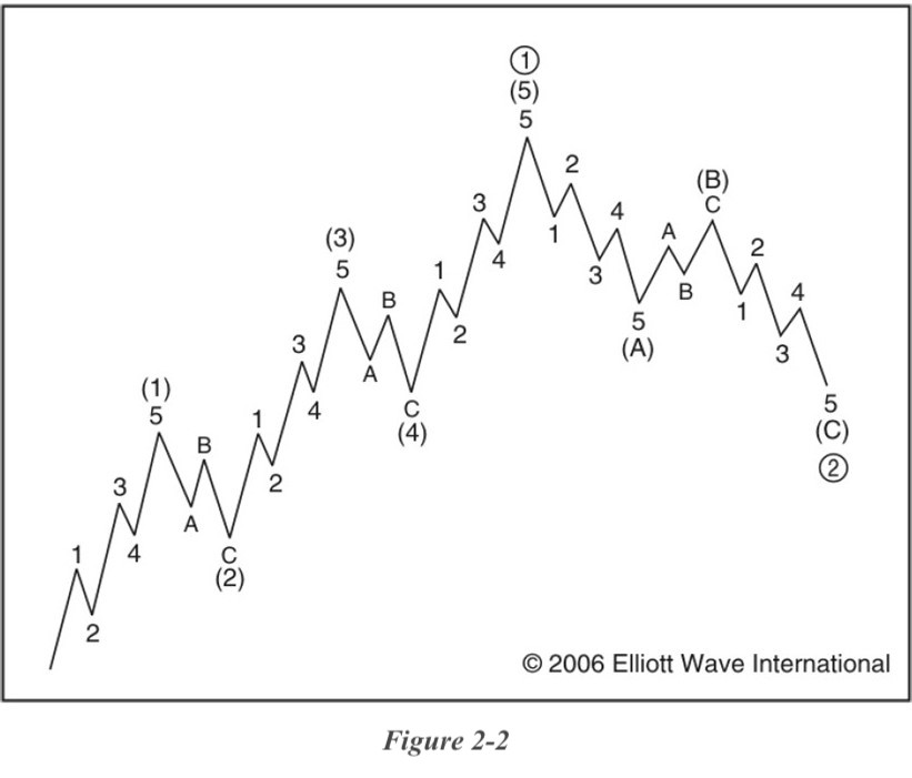 Perhaps most important, Elliott observed that wave patterns form larger and smaller versions of themselves. This repetition in form means that price activity is fractal, as illustrated in Figure 2-2. Wave (1) subdivides into five smaller waves yet is part of a larger five wave pattern. This process is occurring at every degree, all the time, and is the key to understanding what market probabilities are next.