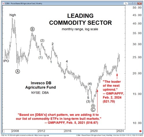 And this is what has followed: The Bloomberg Commodity Index soared to its highest level since 2008 in June 2022, while the Invesco DB Agriculture Fund has continued to catapult higher reflective in the ongoing rise in food prices. The DBA’s most recent upsurge occurred in February 2024, shown below: