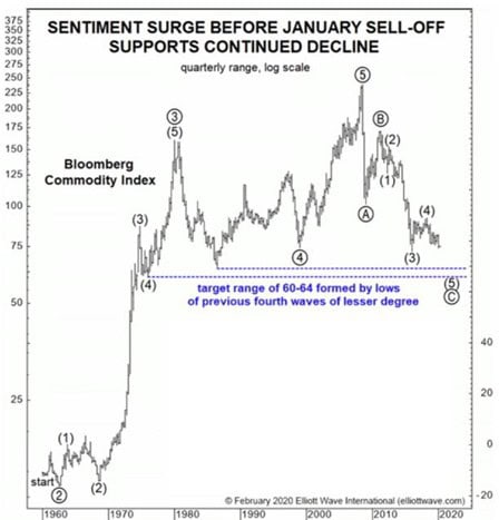 One month later, the March 2020 Global Market Perspective showed that the Bloomberg Commodity Index had fulfilled the “minimum requirements to complete wave (5) of C down.” It wrote: