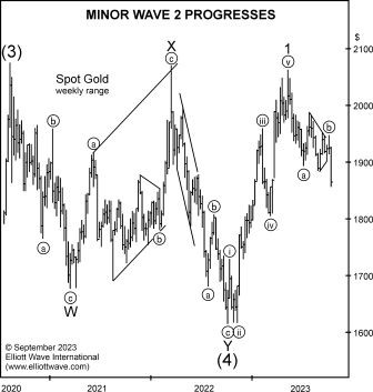 On September 29, 2023, after a long period of neutral commentary about gold, EWI’s Elliott Wave Financial Forecast zeroed in on the “approaching wave 2 low,” which meant a powerful wave 3 rally was about to begin.