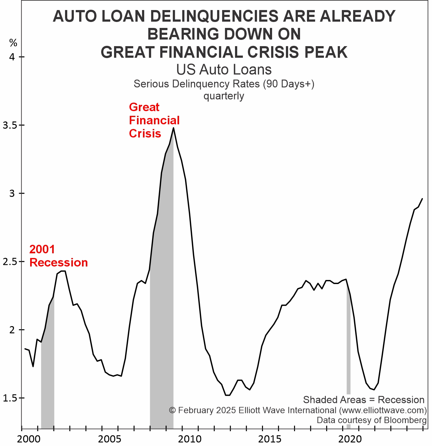 Credit conditions reveal an extreme vulnerability on the part of consumers. In January, for instance, EWFF showed a chart of non-mortgage write-offs soaring to their highest level since the wake of the Great Recession. This chart shows the same rise toward the peak of the great financial crisis in the share of U.S. auto loan payments that are at least 90 days past due:
