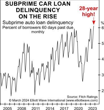If there were such a bumper sticker, the honking on a busy stretch of freeway would be deafening. That’s not hyperbole. Get this: One in four new-vehicle buyers were underwater on their trade-in car loans in the October to December 2024 timeframe, according to Edmunds. On top of that, the average amount owed was higher than ever – more than $10,000. Our Elliott Wave Financial Forecast had its pedal to the metal with this story back in March:
