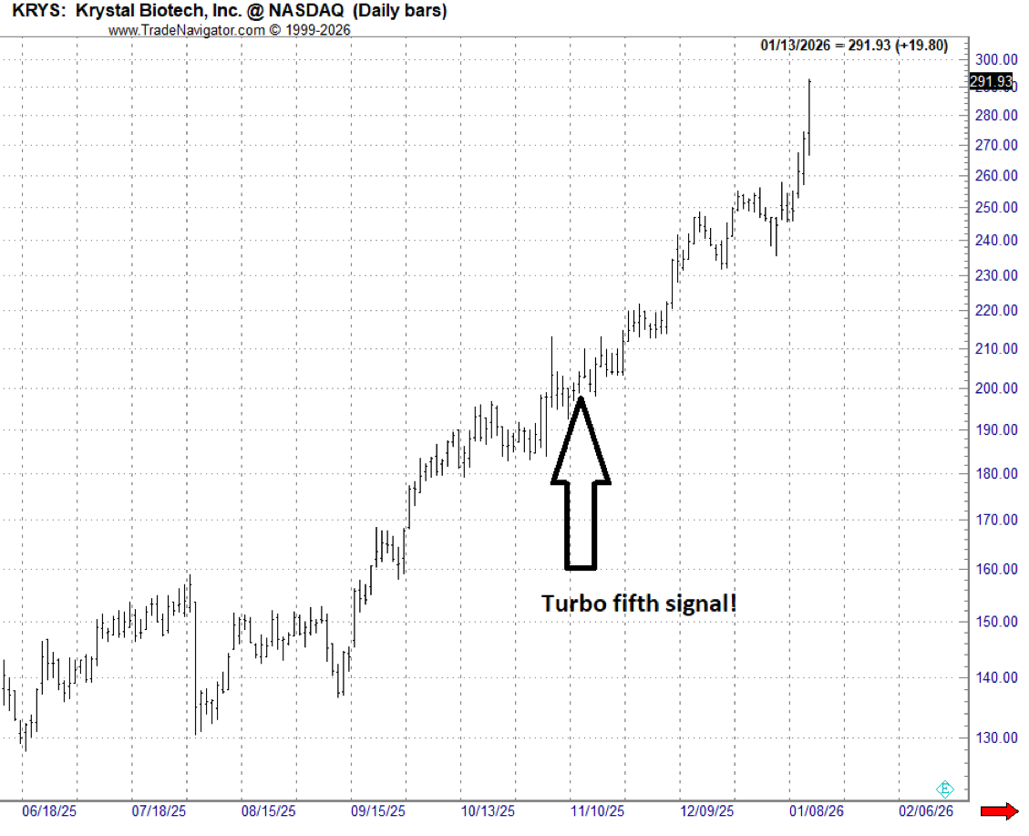 Since appearing in the scan on November 11, KRYS has rallied from 203 to 295—a 45% gain as of January 14.