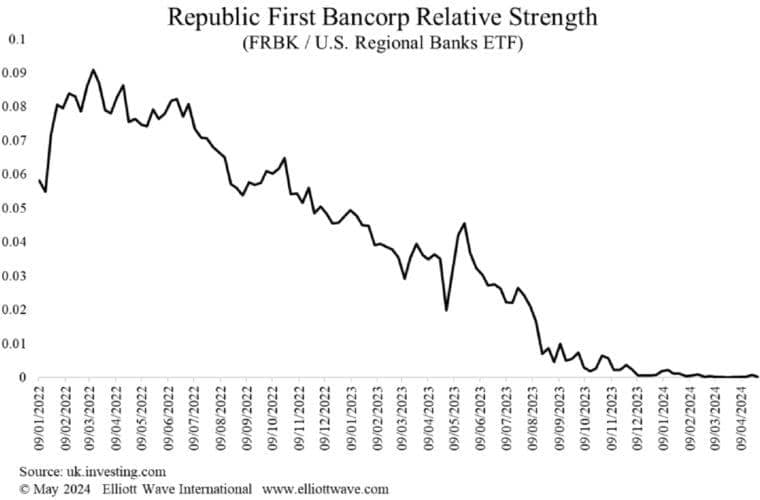 The chart shows that the share price of Republic First was underperforming the iShares US Regional Banks ETF (ticker IAT) since 2022, with that trend accelerating lower in the summer of 2023. It was a warning that something was up at the bank and, sure enough, existential problems have now emerged. The Republic First Bank failure should not be a surprise to anyone who was tracking the share price.