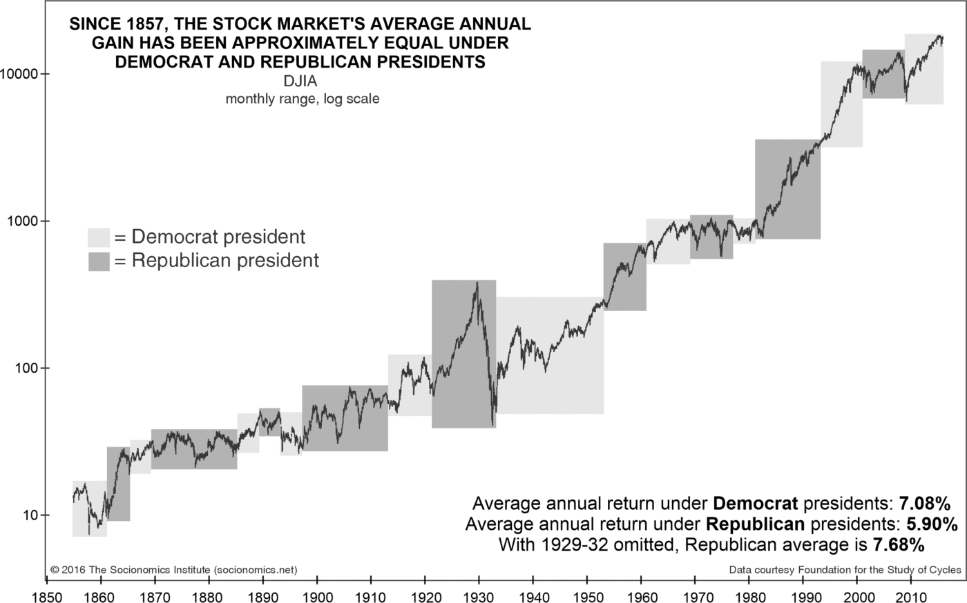 …from 1857 to 2015, there was a 7.08% average annual rate of return in the stock market under presidents who were Democrats, while under Republicans the rate was 5.90%.