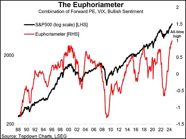 TopDown Charts publishes an indicator combining three measures of sentiment: (1) sentiment readings from investor surveys, (2) the forward PE ratio, i.e. stock prices vs. the consensus for earnings over the next 12 months, which is a reflection of the degree of confidence in future earnings growth, and (3) the VIX, which measures whether stock price changes reflect panic or complacency. The latest readings have set an all-time record, as you can see in the chart below.