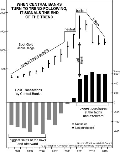 Does heavy buying or selling of an investment item by central banks make the price of that asset rise or fall? You might be surprised. This chart and commentary from the Socionomic Theory of Finance is eye-opening.
