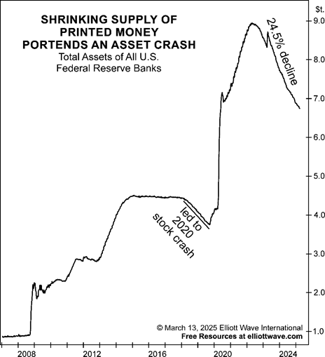 Another cylinder in the liquidity engine has been debt monetization by the Federal Reserve. That trend, however, ended three years ago. The chart below shows that over the past three years, the Fed has shed $2.2 trillion worth of bonds and mortgages, bringing the total value of its balance sheet down from $8.97 trillion in April 2022 to $6.76 trillion in March 2025. That is a decrease of 24.5%.