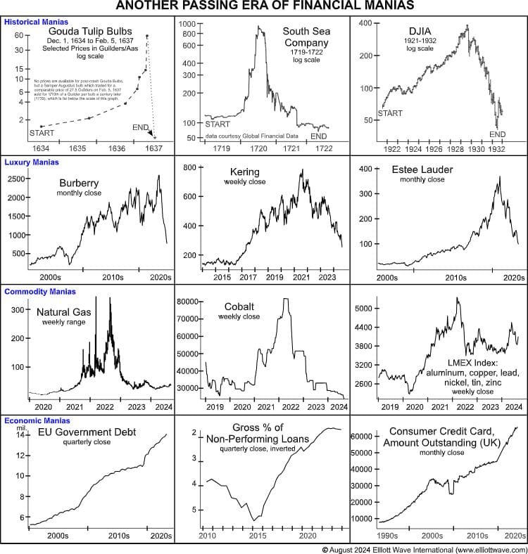 In a 1997 Special Report titled “Bulls, Bears and Manias,” The Elliott Wave Theorist illustrated three of history’s most dramatic manias — Gouda Tulip Bulbs from 1634 to 1637, the South Sea Company from 1719 to 1722, and the Dow Jones Industrial Average from 1921 to 1932 — and noted that “every mania is followed by a decline that ends below the starting point of the advance.” GMP returned to the idea in October 2023, illustrating no fewer than nine collapsing manias from vaccine makers (BioNTech, Moderna, Novavax) to online delivery companies (Delivery Hero, Just Eat Takeaway and Door Dash) to former high-flying debt markets like green bonds and ultra-long dated debt.