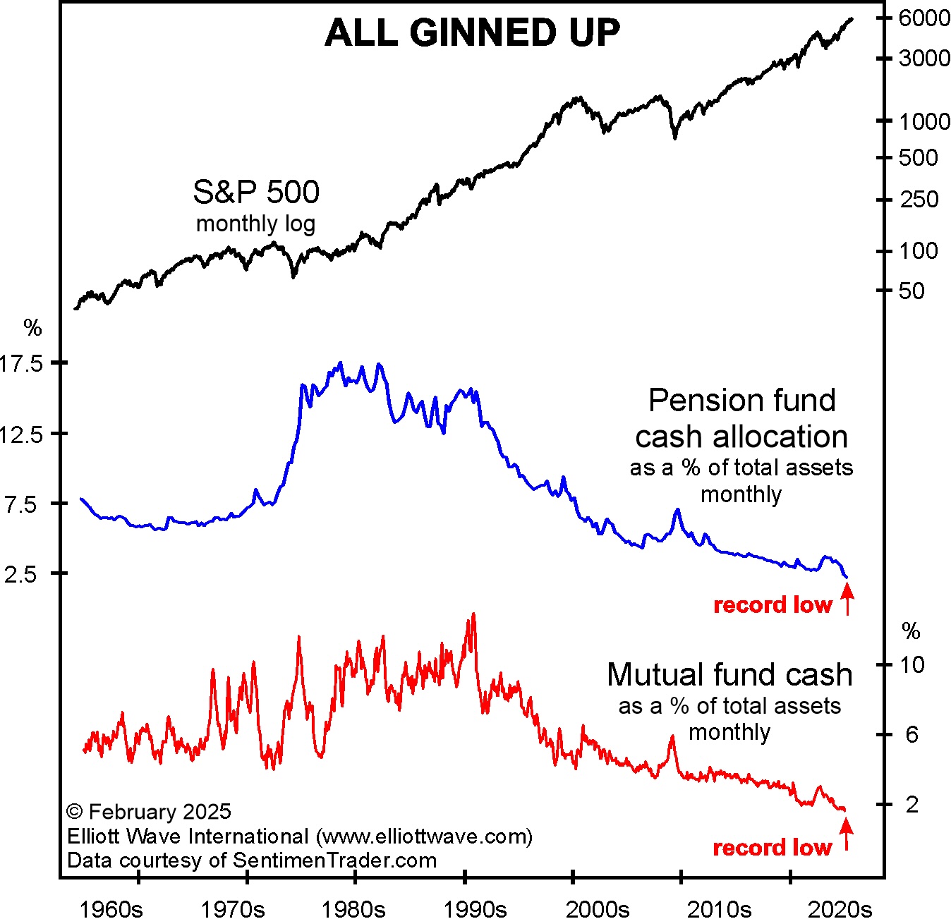 In 2000, as the NASDAQ approached top tick, the March 2000 issue of The Elliott Wave Financial Forecast observed that U.S. mutual funds had just 4.2% in cash relative to assets in mutual fund accounts, the lowest ratio since January 1973… noting that the 1973 reading came “right before the biggest stock market decline since the Great Depression.” A shining new era for cash had in fact dawned, as the NASDAQ Composite started a 78% decline a few days later. The December [2024] mutual fund cash-to-assets ratio slid to a mere 1.6%. As shown on the chart below, this latest tick marks a new record low. This is not a small-scale extreme but one of epic proportion: