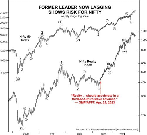 Our May 2023 issue identified the Nifty Realty Index as the leading sector of the then-burgeoning rally. Since then, it has maintained that lead, more than tripling at its recent peak since the 2023 low. The leader has recently begun to lag after possibly completing a five-wave advance from its 2023 low. That may mean that the Nifty 50 Index will soon complete wave ((v)) of 3 up as well. If the realty index were to rise to new highs, then it would nullify the recent divergence and suggest that the rally in both indexes will continue.