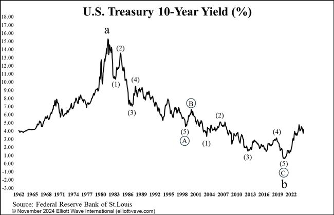 The driver of Elliott wave patterns is crowd psychology and herding behavior. That is the same across all markets. However, bonds, bills and currencies do not act the same way as the perpetual 5-up, 3-down of the stock market. These are what might be referred to as “bounded” markets. The U.S. Treasury 10-year bond yield is not on a perpetually upward or downward trajectory. Bounds exist. Nobody can rule out bond yields spiking to 50% or 100%, but it would be highly unusual and there is no natural trend like there is in the stock market. Up until a few years ago, most people thought that zero was the lower bound for bond yields. That changed when many bonds traded with negative yields. Nevertheless, the point remains that there is not a long-term 5-3 path in bonds.