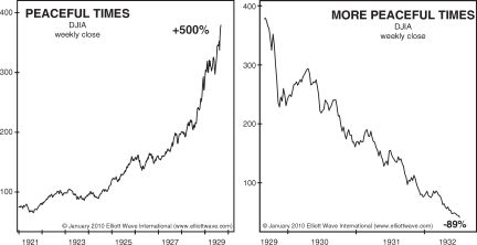[The chart on the left] provides an example from the 1920s in which stock prices seemingly benefited from peaceful times. The Dow rose over 500% in just eight years as peace mostly reigned around the globe.
