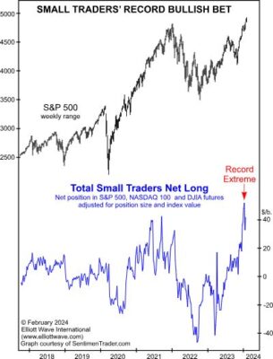 [A] new record was recently reached in the net long position of Small Traders as published weekly in the Commitment of Traders Report. The combined net long futures position of Small Traders in the S&P 500, NASDAQ 100 and DJIA soared to an all-time high of $51.59 billion on January 9. The total easily exceeds the prior net long extreme of $42.06 billion in September 2021.