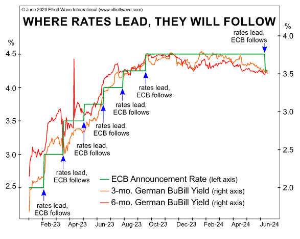 The U.S. Fed, Bank of Japan, Australian Central Bank – they all follow the short-term yield. We’ve shown multiple charts in our publications proving this point. If you’re still in doubt, here’s a handy chart our Global Market Perspective subscribers saw recently that proves that the European Central Bank also follows the yields on the local short-term government debt to guide its interest rate decisions: