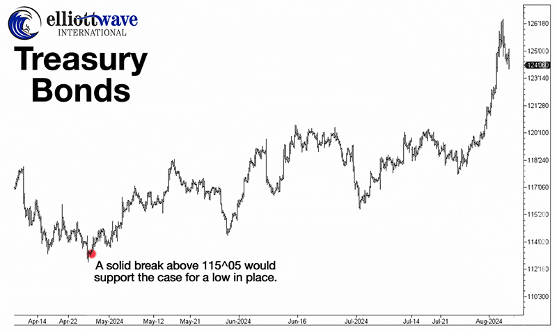 Which brings us full circle back to where we started: The yield on the 10-Year U.S. Treasury notes has just fallen to levels not seen since March while the 3-month U.S. Treasury Bills yields have just made a new low for 2024. As forecast by Elliott waves.