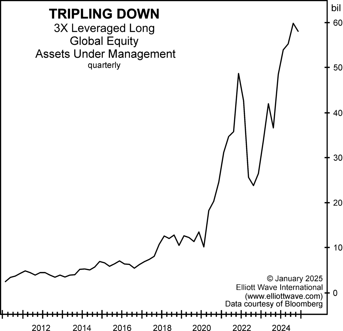 The chart below shows what can only be described as investors’ lust for risk in the form of a bet on a triple return on stocks. The very idea of tripling stock returns is not something that could happen outside a bull market top of great significance. The much higher degree peak that is now forming is clear by the total assets under management in 3X leveraged long equity funds, which are six times the level of 2018: