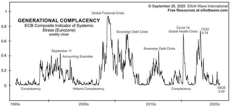 In October’s Global Market Perspective, EWI highlighted the sharp decline in the ECB’s Composite Indicator of Eurozone Systemic Stress — a broad, 15-component measure of credit, liquidity, and market tension. It has fallen from 0.74 in late 2022 to 0.02, essentially signaling no stress at all.