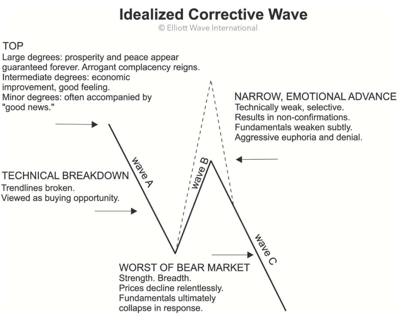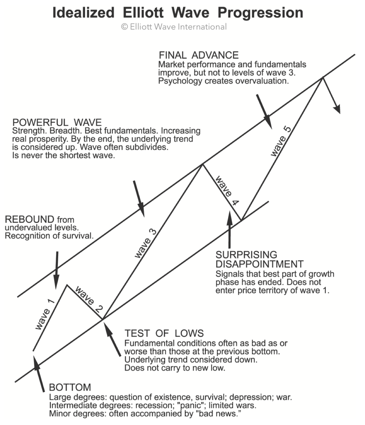“The Wave Principle” is Ralph Nelson Elliott’s discovery that social, or crowd, behavior trends and reverses in recognizable patterns. Elliott isolated patterns of directional movement, called waves, that recur in markets. These waves reflect mass psychological states. The two charts below summarize some of their characteristics.