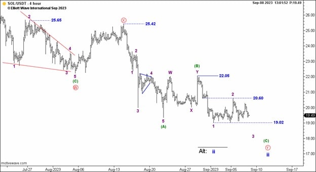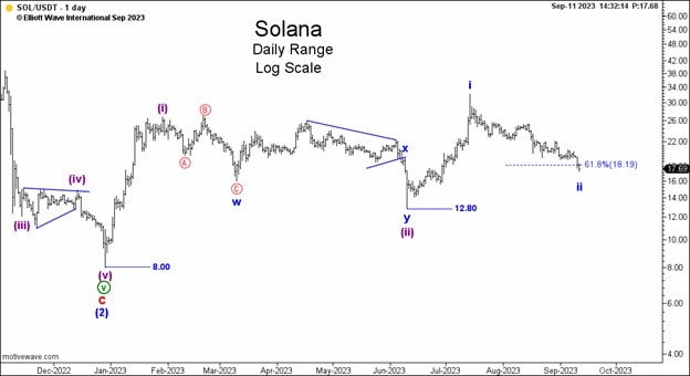 Then on September 10, our Crypto Pro Service daily coverage of Solana showed this pair of labeled price charts. Both pictures told the same story: Solana’s downtrend underway since mid-July was a second-wave pullback, which was nearing its end. From the September 10 Crypto Pro Service:
