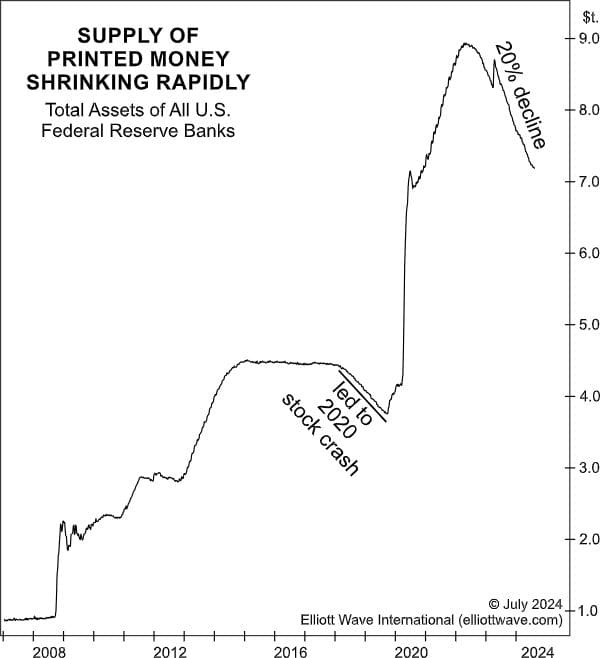 Monetary inflation … is unlikely to continue. Why? because since early 2022 the Fed’s clear aim has been to reduce the size of its balance sheet. Over the past two years, the value of the Fed’s assets, representing “printed” money, has gone from $8.94 trillion to $7.22 trillion, a decline of nearly 20 percent.