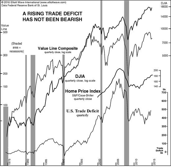 This chart, from The Socionomic Theory of Finance, reveals that had economists expressed relief whenever the trade deficit began to expand and concern whenever it began to shrink, they would have quite accurately negotiated the ups and downs of the stock market and the economy for 40 years.