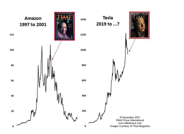 Here, in the December 15, 2021 European Short-Term Update we featured Tesla in a special segment titled “This could be the cherry on top of the icing on the cake.” There, we referenced the Paul Macrae Montgomery “magazine-cover indicator,” for which TIME magazine was used as a proxy for his initial studies. The Dec. 15 European Short-Term Update takes it from here: