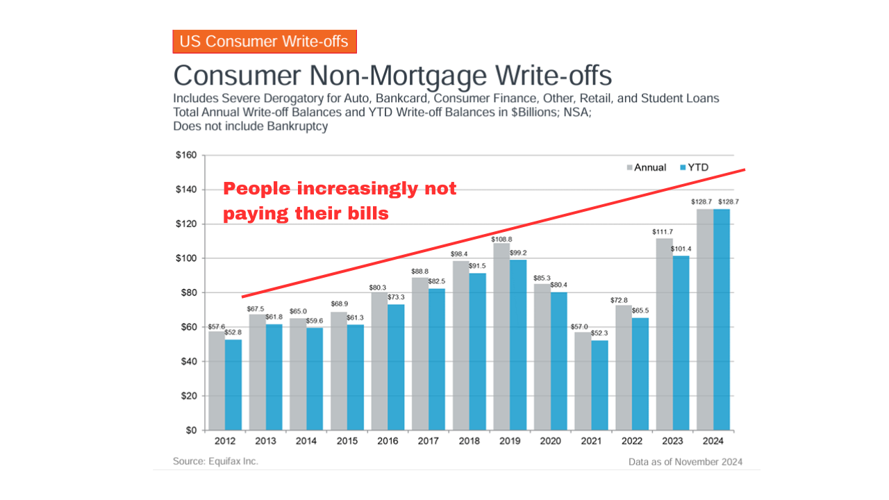 We keep hearing about the soft-to-no-landing economic scenario. According to Polymarket’s prediction market, the chance of even a small economic contraction is disappearing. Expectations of a recession by May 2025 were already slim as of September 26, registering just 32%. Through the fourth quarter, however, they fell to almost non-existent, as the tally on Jan. 2 was 7%. This result contrasts sharply with the latest data from Equifax, which shows the dramatic extent to which consumers are already feeling the burden of over-indebtedness. In the first eleven months of 2024, total write-offs on consumer debt—auto, credit card, general finance, student and other retail loans—hit $128.7 billion, easily surpassing annual totals going back through 2012. In 2009, the year the Great Recession ended, Equifax’s non-mortgage, consumer loan write-off total was $130 billion, a difference of just 1% from the latest reading. So, consumers are in the unenviable position of having to begin the next economic contraction where they left off at the end of the last one: