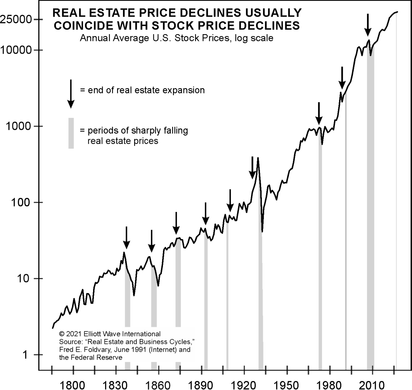 You know that prices for U.S. real estate are nowhere near a bottom when a vacant lot in Palm Beach, Fla. just hit the market for $200 million (realtor.com). And this is just days after a similar lot sold for $178 million. When can you expect the “bust” phase to start? Watch the stock market. As Robert Prechter’s book, Last Chance to Conquer the Crash, notes: