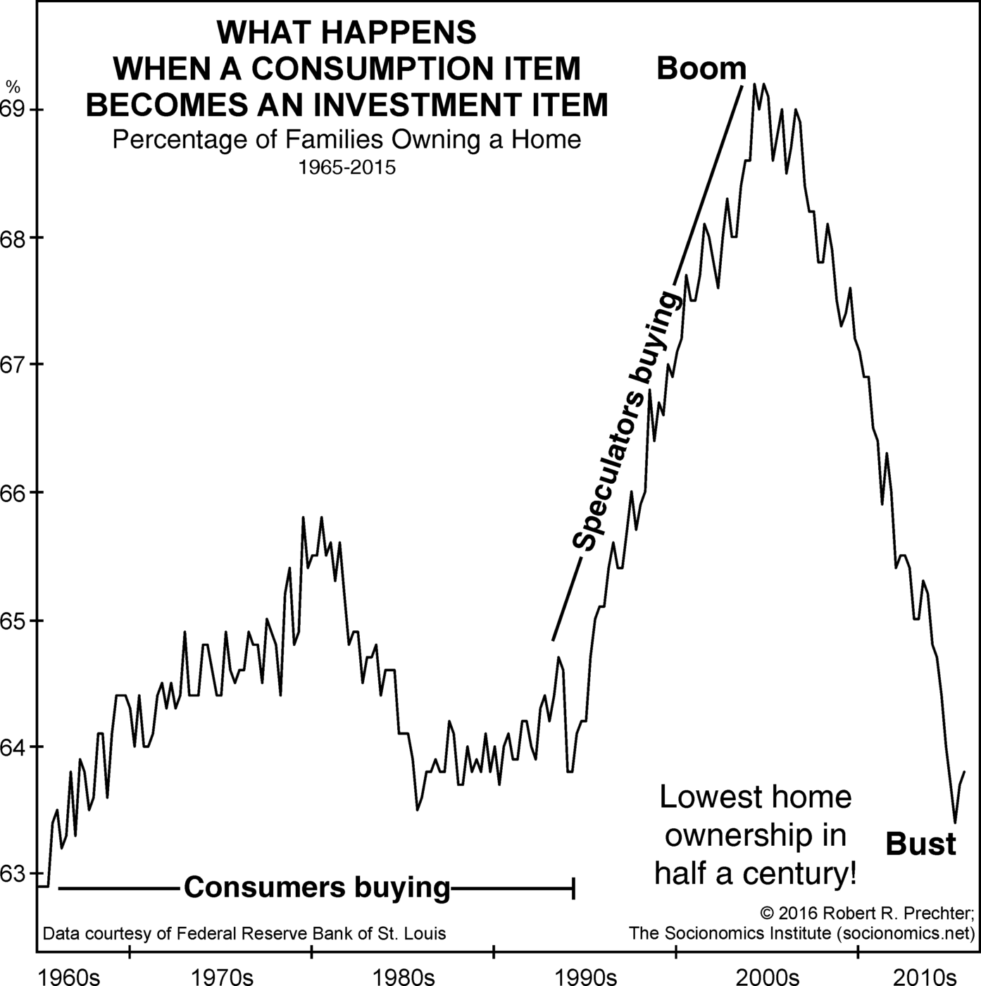 If you’re wondering how real estate prices soared in the first place, keep in mind that many people – as well as corporations – bought property as investments instead of as a place to live. This makes a big difference, as Prechter explains in The Socionomic Theory of Finance: